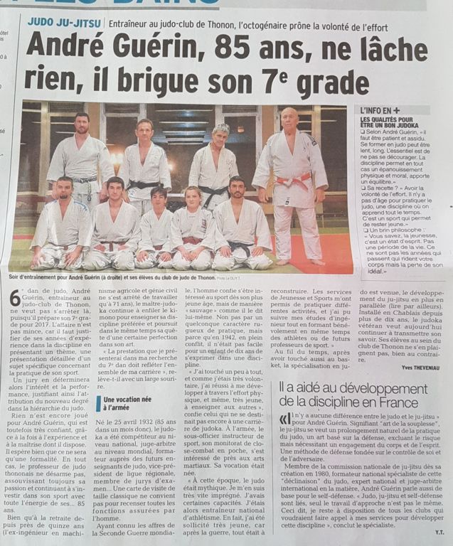 Notre sociétaire André Guérin avait droit aux honneurs de la presse cette semaine : le reporter du Dauphiné Libéré Yves Theveniau est venu à la rencontre d’un personnage, athlète de haut niveau, entraineur passionné et dont les performances et l’implication dans le développement du judo-jujitsu lui permettront prochainement d’accéder au 7e dan.