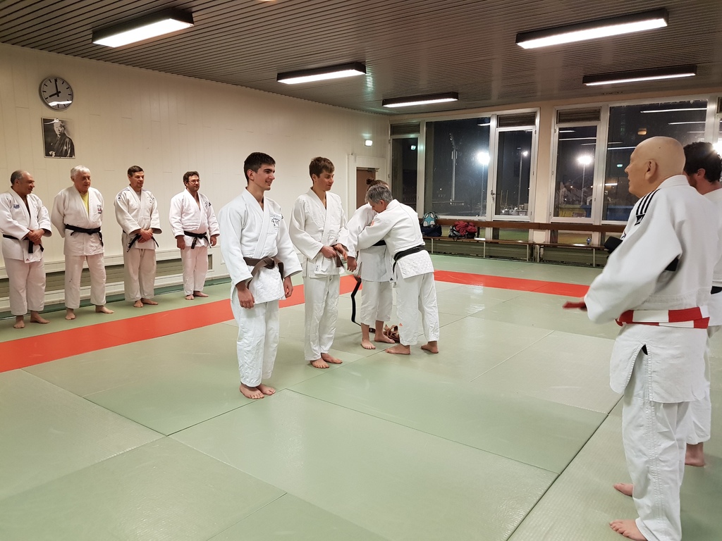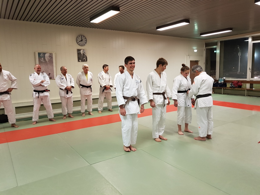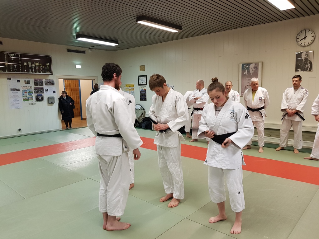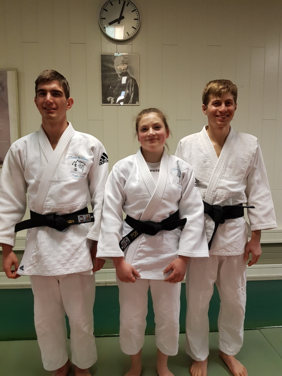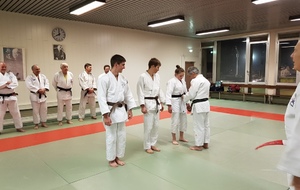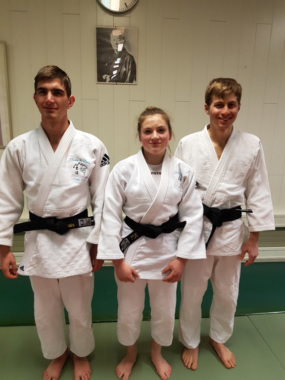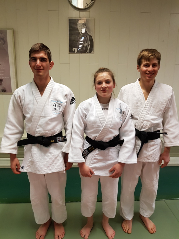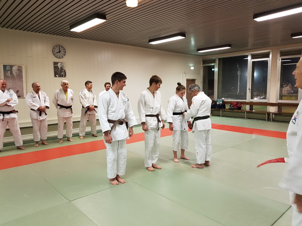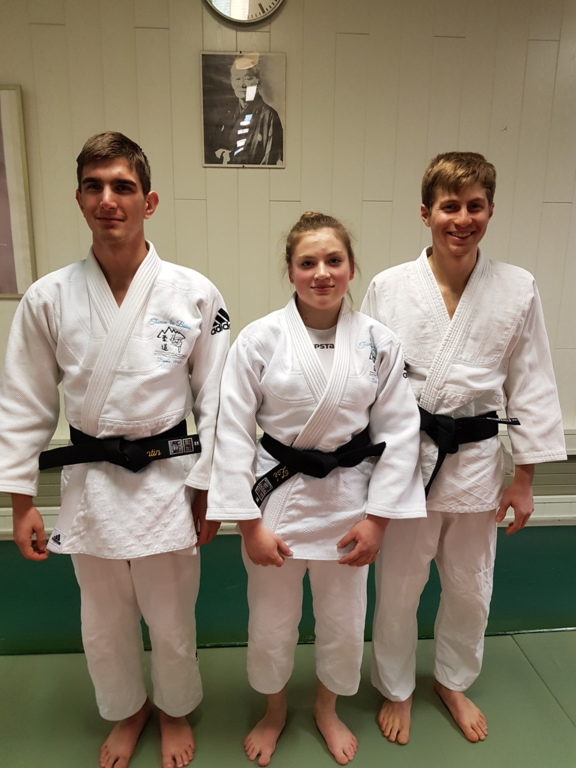 Ainsi, Zoé Jacquier, Tristan Veyrat et Corentin Gosselin ont reçu des mains de Bruno Hamon (4ème dan), Adrien de Tapia (4ème dan) et André Guérin (7ème dan) leur 1er dan, symbole de commencement dans le monde du judo.