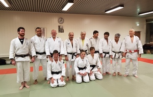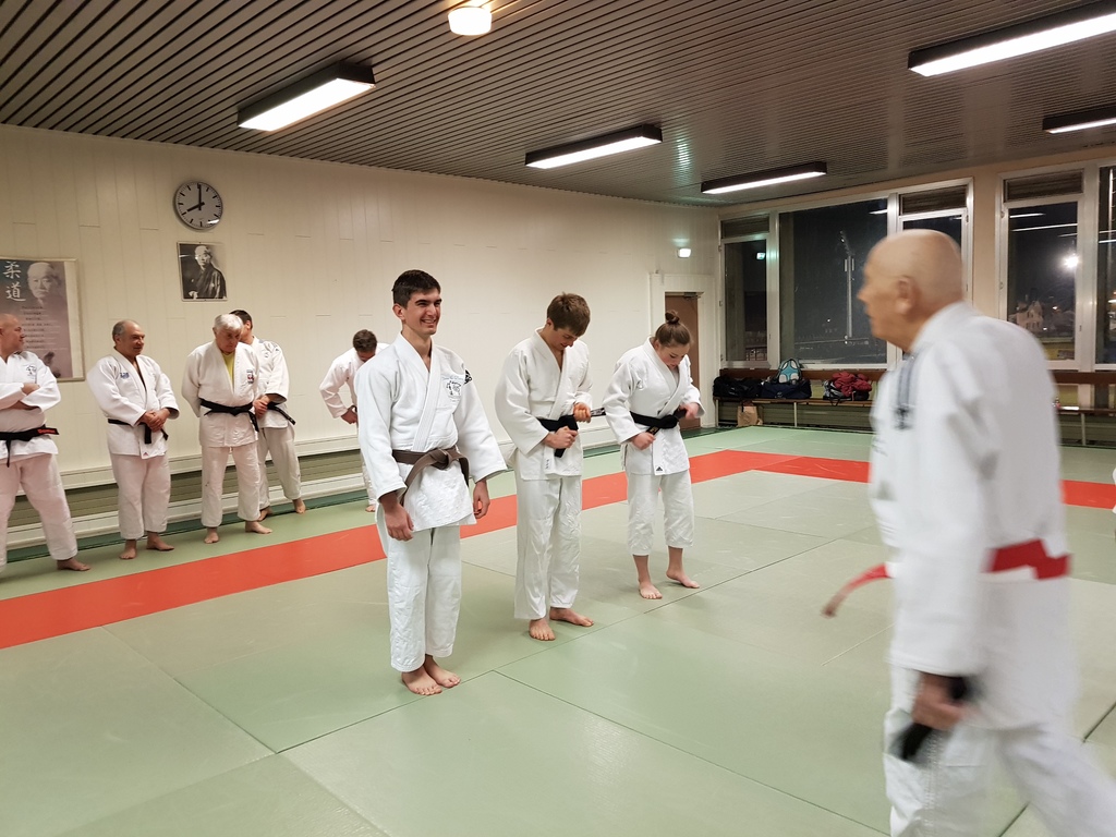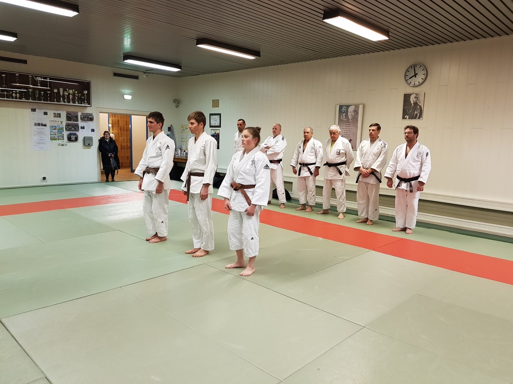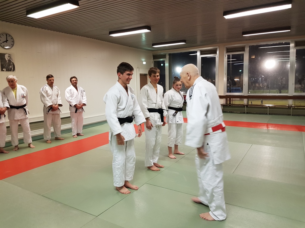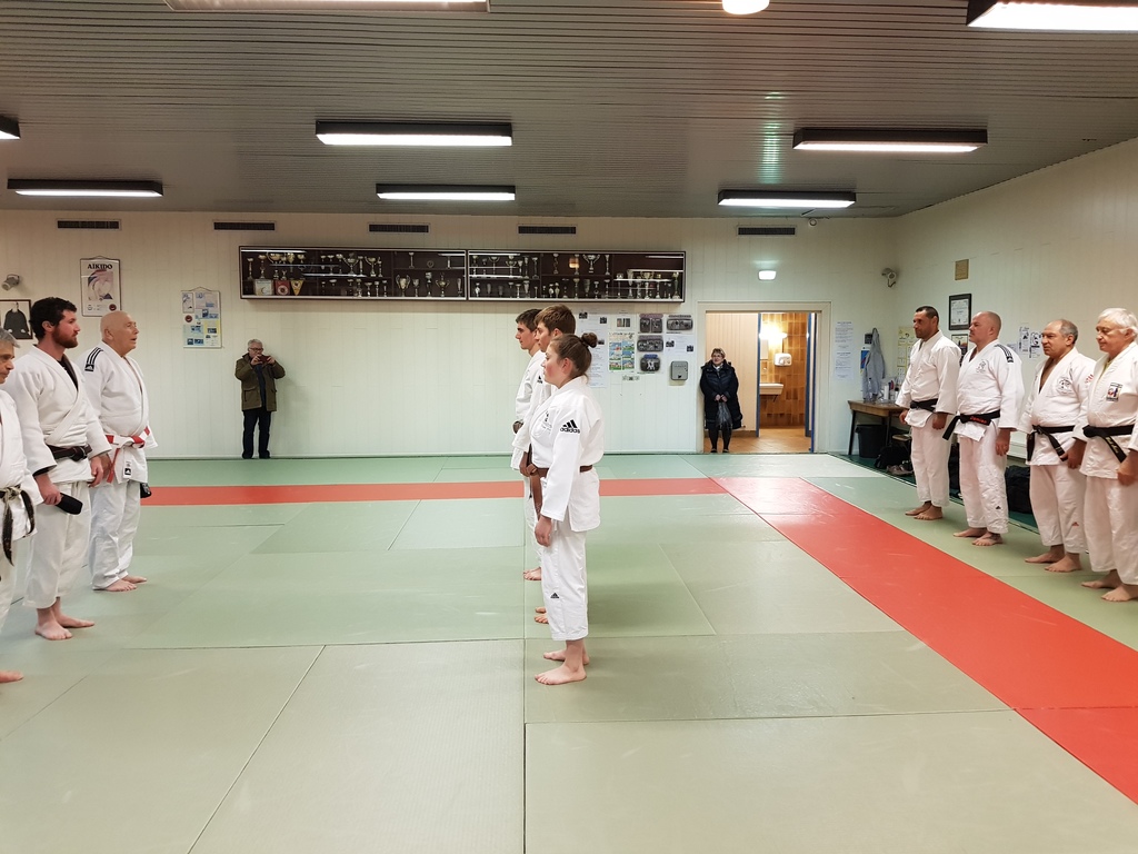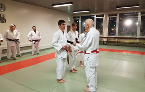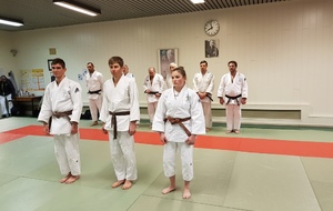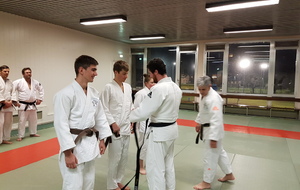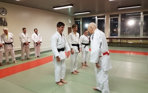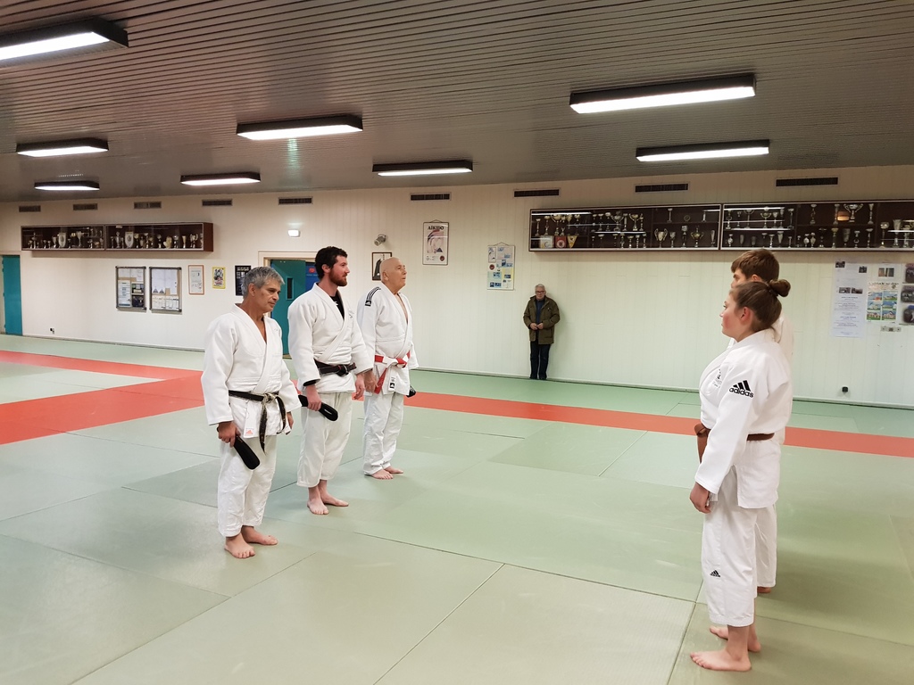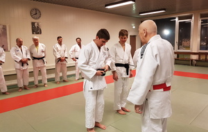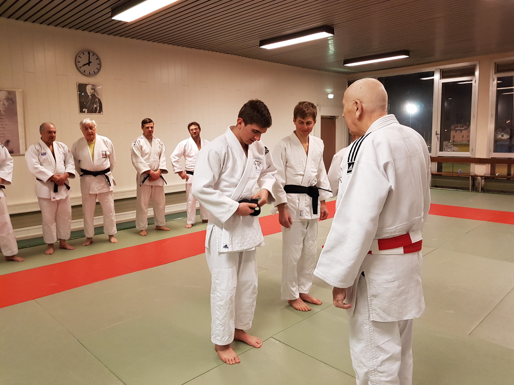 Ainsi, Zoé Jacquier, Tristan Veyrat et Corentin Gosselin ont reçu des mains de Bruno Hamon (4ème dan), Adrien de Tapia (4ème dan) et André Guérin (7ème dan) leur 1er dan, symbole de commencement dans le monde du judo.