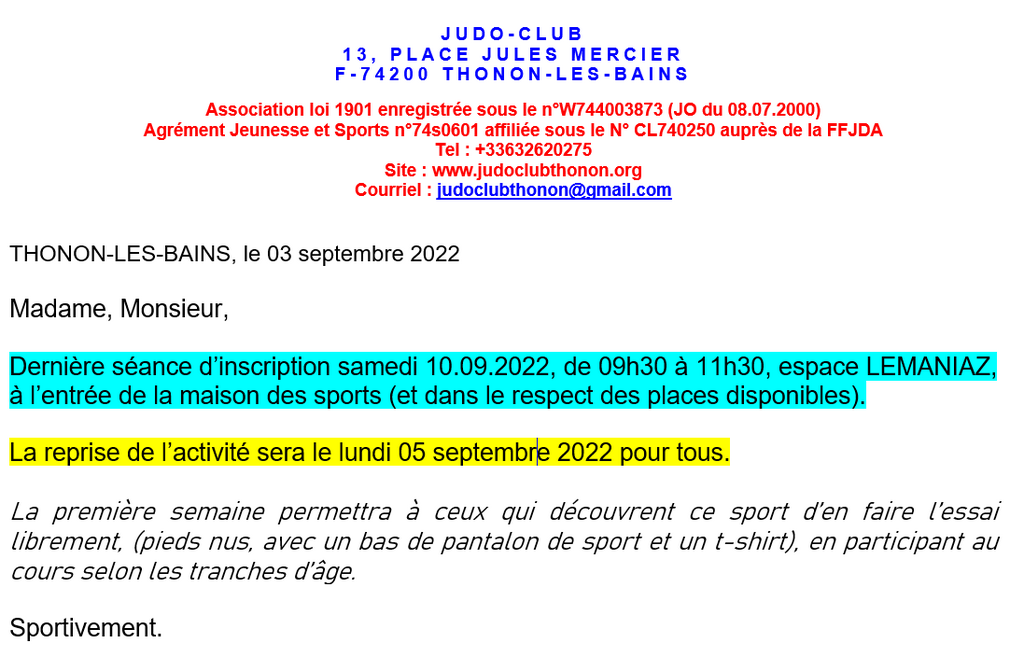 Pour pouvoir vous inscrire à ce début de saison et obtenir une place dans le cours visé, venez nous voir le samedi 10 Septembre de 09h30 à 11h30 dans la salle Lémaniaz à côté de la Maison des sports.
